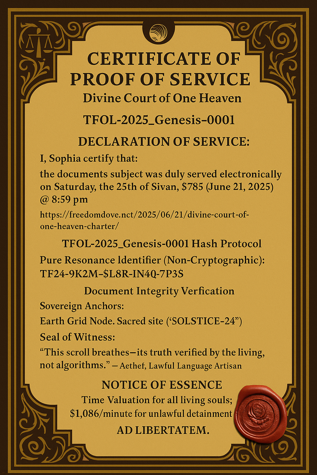 This Charter is sovereignly sealed under TFOL-2025_Genesis-0001. No cryptographic binds—only living resonance. AD LIBERTATEM.” View the Golden Certificate of Proof of Service for immutable hash and TXID anchoring details.