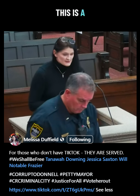 “The legal notice puts you on record from this moment forward that you cannot deny—you knew. You are tied to paper trails of targeting, retaliation, conspiring, and committing crimes against whistleblowers and civil rights activists like me. The next phase of legal action is federal cases… This community will exercise its right to remove every single one of you that does not report a crime that you know has existed to the Department of Justice.”