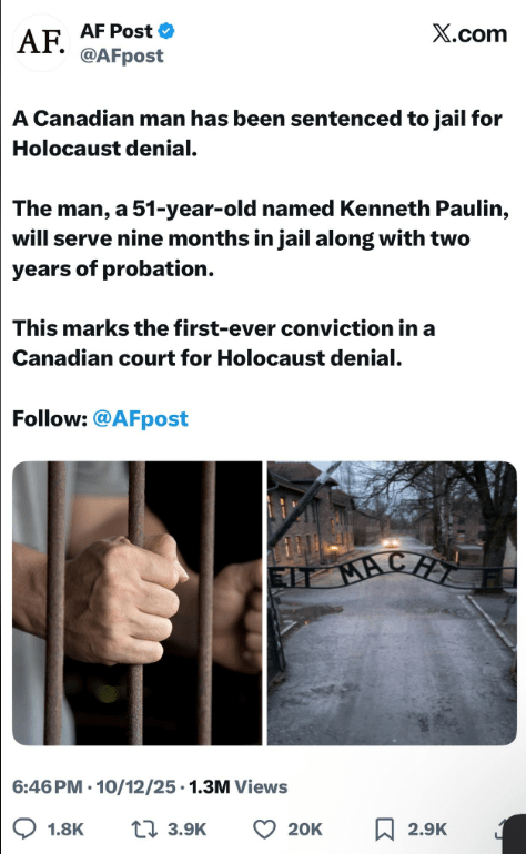 How did the court get jurisdiction over a man’s opinions expressed online, and what laws were used to convict? The man’s name is Kenneth Paulin (age 51, North Bay, Ontario). On September 18, 2025, he was sentenced to 9 months in custody plus 2 years’ probation after convictions for (i) wilful promotion of hatred and (ii) wilful promotion of antisemitism by condoning, denying or downplaying the Holocaust. Crown prosecutors characterized it as Canada’s first jail term specifically tied to Holocaust denial.