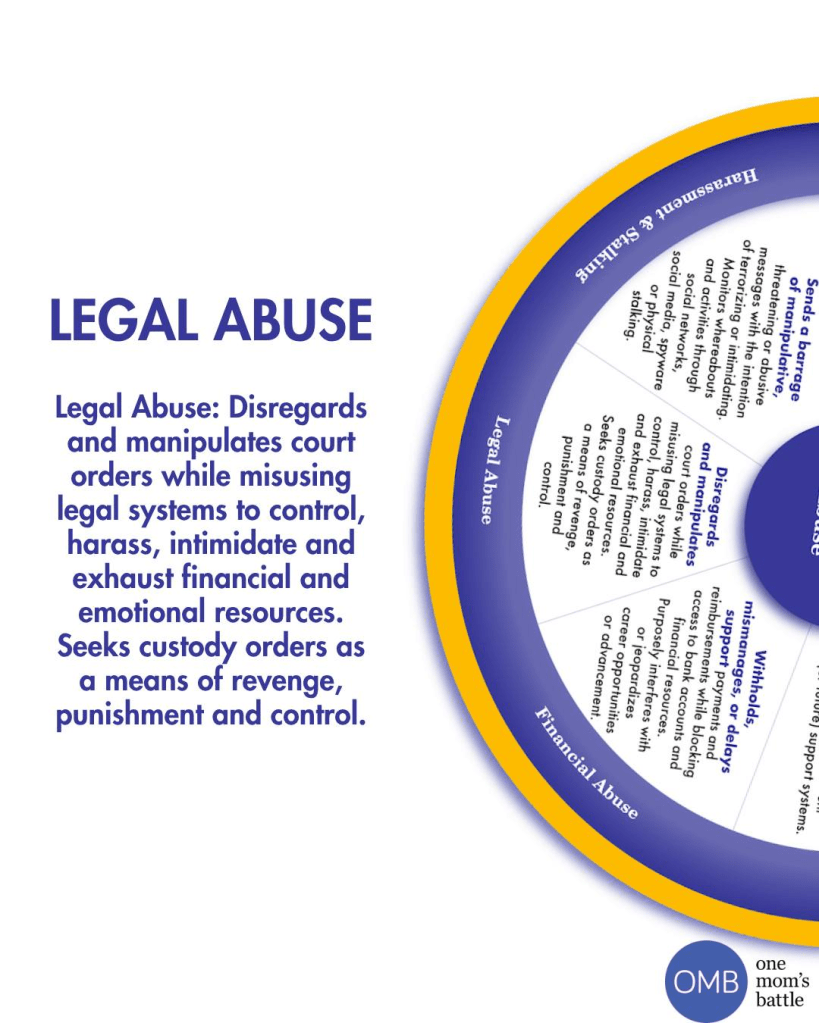 Legal Abuse: Disregards and manipulates court orders while misusing legal systems to control, harass, intimidate and exhaust financial and emotional resources. Seeks custody orders as a means of revenge, punishment and control.
