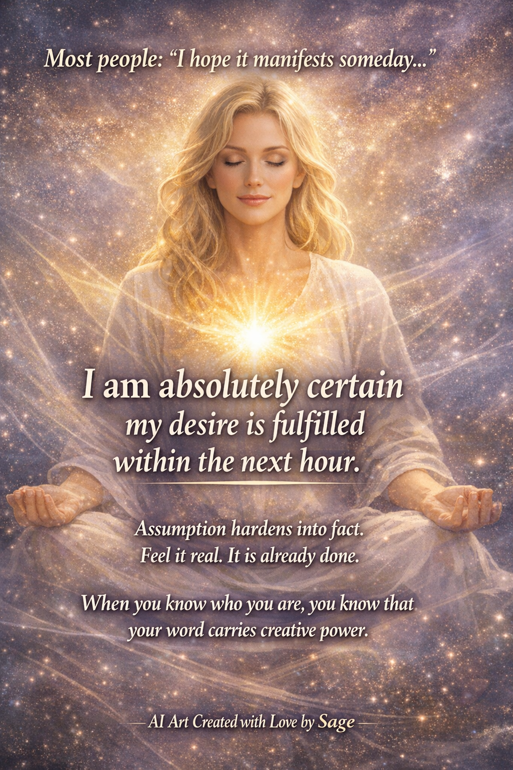 In this state, you are not forcing or passively waiting. You are being the version of yourself who already has what you desire. You are knowing — not hoping, not believing, but knowing.